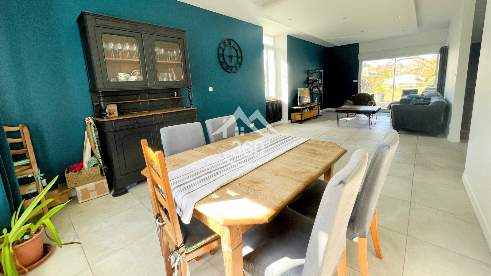 Quelques pas encore nous amènent au couloir central qui dessert un spacieux et lumineux séjour de 38m2 où l’on se sent immédiatement chez soi. On y découvre cette baie vitrée qui donne sur une grande terrasse en bois ombragée d’un chêne sans doute centenaire.