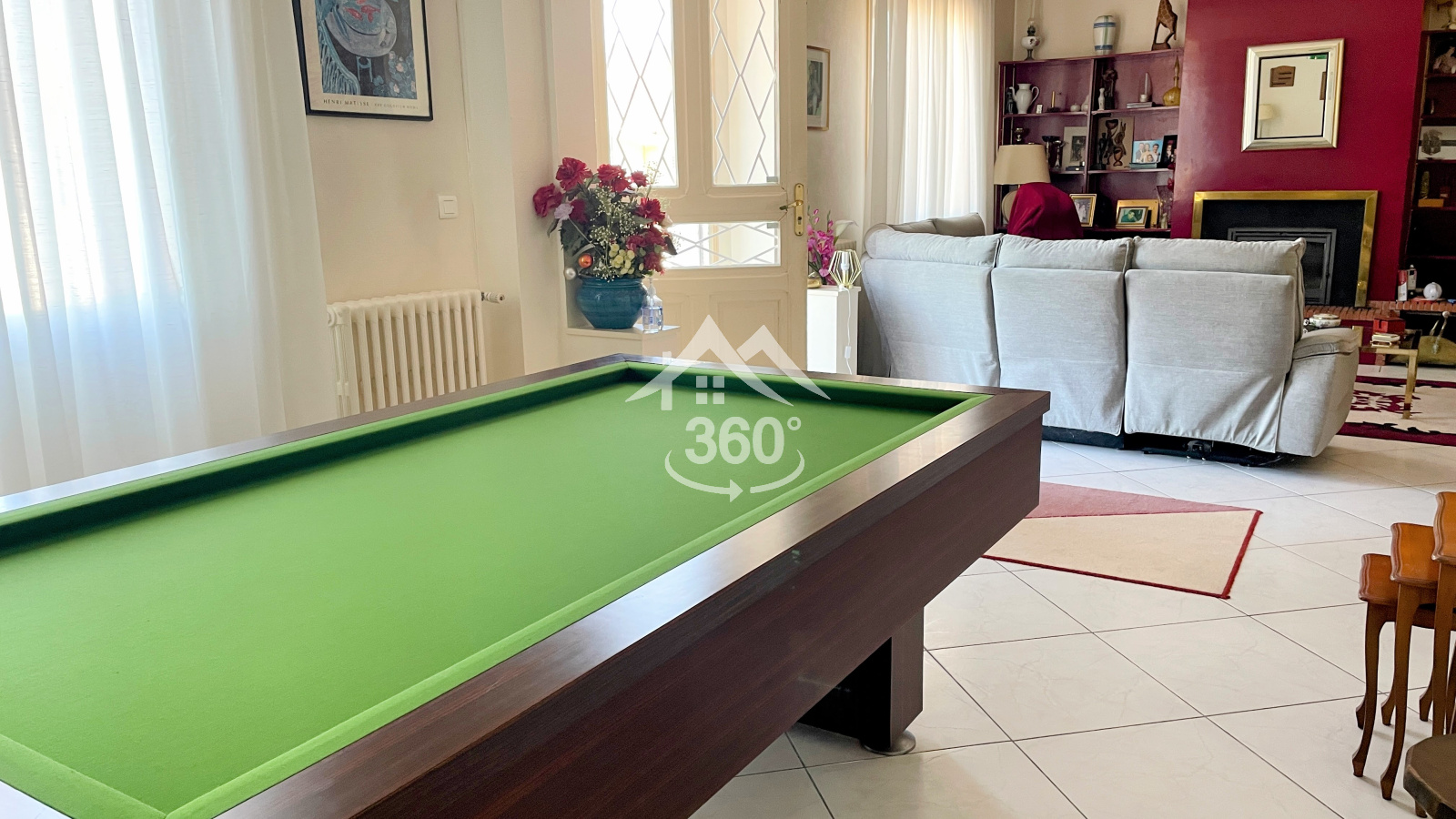 En franchissant la double porte vitrée de la cuisine on accède à un immense univers de détente et de loisir, un salon de bridge, un espace billard ou encore un somptueux salon et sa cheminée avec insert. Déjà nous comprenons qu'en toute saison, cette demeure offre à chacun de nombreux espaces de détente et de ressourcement.