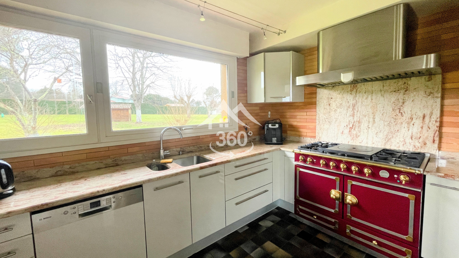 Une grande cuisine séparée avec son cellier, eux aussi très lumineux, viennent compléter ces espaces de vie, tout est là pour préparer de bons repas, y compris un barbecue intérieur et extérieur.