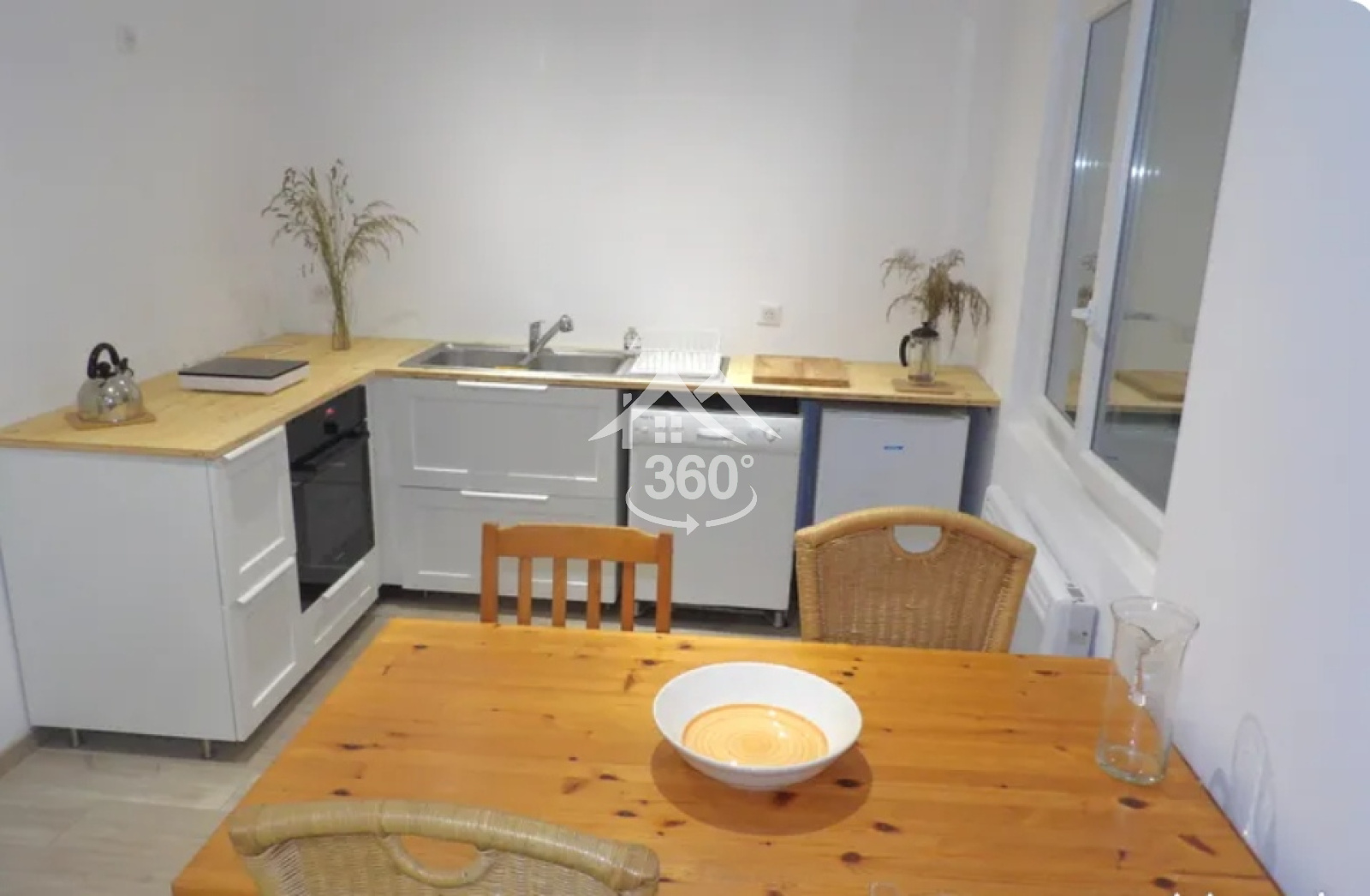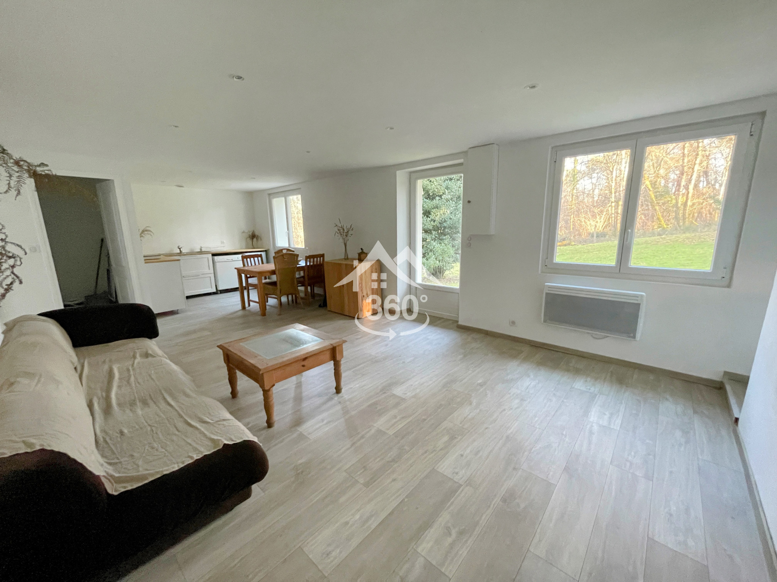 En entrant, vous êtes accueilli par un vaste espace : d'un côté, un joli salon, et de l'autre, un coin cuisine, tous deux baignés de lumière grâce à deux fenêtres donnant sur la clairière.