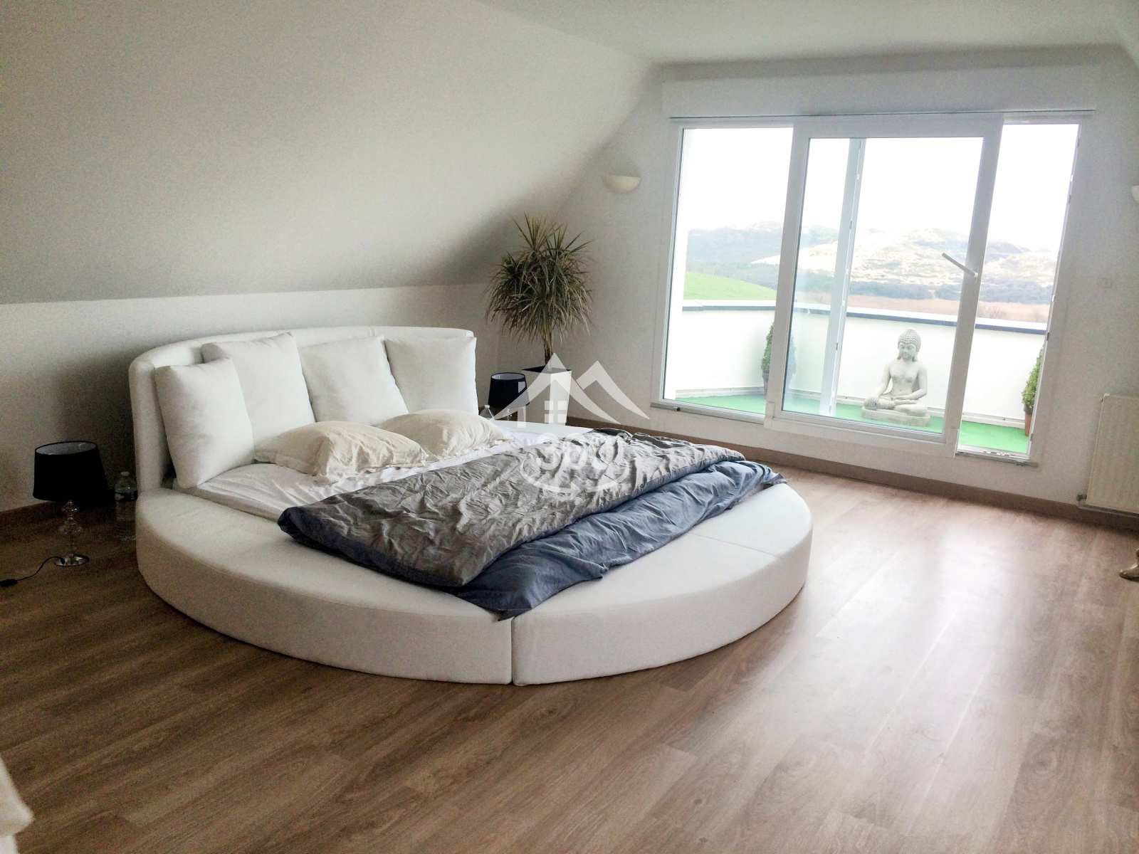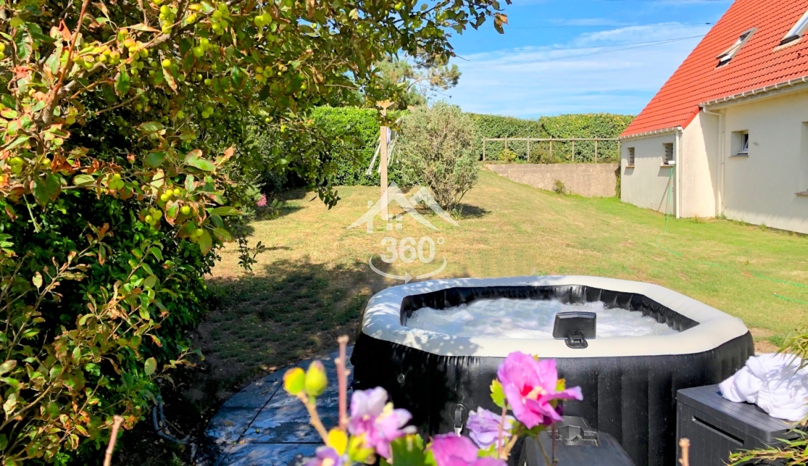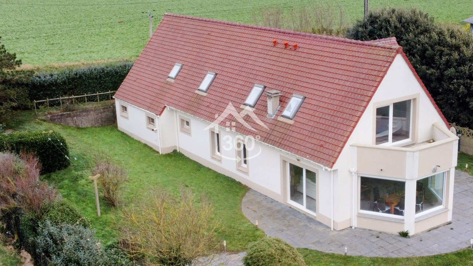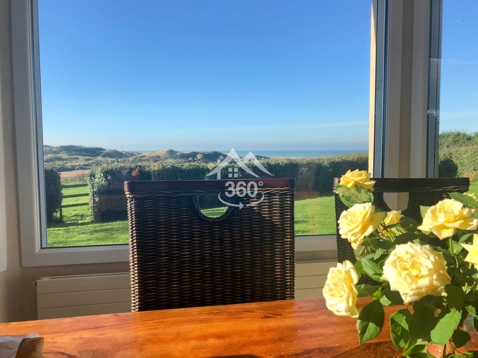 EN EXCLUSIVITE - Construite en contrebas de la route, nombreux sont ceux qui sont passés cent fois devant cette discrête villa sans même imaginer les trésors qu’elle recèle. Ceux qui se donneront la peine découvriront d'emblée ce vaste couloir joliment mis en valeur par ses arcades qui laissent déjà percevoir plusieurs pièces plus lumineuses les unes que les autres, mais à coup sûr, c’est la plus vaste et la plus lumineuse d’entre elles qui va vous attirer comme un aimant. Vous entrez dans le coeur de la maison (enfin celui du rez-de-chaussée) ce vaste salon de plus de 35m2 offre une immense surface vitrée de plus de 8 mètres avec une vue panoramique directe sur la baie de Slack et ses immenses dunes sauvages et sur la mer jusqu’au fort d’Ambleteuse. Un panorama unique que peu de propriétés sur la côte d’opale peuvent offrir. Et si vous pensez, qu’à la longue, on peut se lasser de cette vue, rassurez-vous, la nature se charge de la rendre toujours nouvelle. A ce stade, il est possible que vous oubliiez la visite pour juste prendre place dans ce canapé confortable et vous régaler du spectacle. Mais il faut continuer, du salon à la cuisine il n’y a qu’un pas que nous franchissons pour réaliser que cette cuisine, bien que de taille moyenne n’est pas en reste, elle dispose également de sa baie vitrée orientée au sud et d’une jolie terrasse sans vis-à-vis où vous pouvez prendre vos repas en profitant de la même vue magique que depuis le salon. Profitons d’être à l’extérieur pour découvrir le terrain de 1000m2 entièrement clos et arboré, Bonne surprise, coté route il y a une haie épaisse qui nous protège de la vue et du bruit. Qu’est ce donc que cette petite terrasse circulaire plantée entre bambou et cerisier du japon ? c’est un espace Jacuzzi, tout est prêt pour le brancher. Peut-être avez-vous aussi remarqué ce portillon côté sud. C’est aussi une des pépites de cette maison, il permet d’accéder au chemin de randonnée qui mène aux plages nord et sud, aux dunes de Slack et au centre du village sans voir une seule voiture. Il permet également d’aller caresser les chevaux dont seul le pré vous sépare de la mer. Vous êtes déjà conquis, et, de retour à l'intérieur, vous remarquez à peine cette chambre pourtant spacieuse, ce bureau, ce cellier ou encore cette salle de bains avec bidet et douche italienne et ce WC séparé qui constituent le rez-de-chaussée. Ne vous déconcentrez pas, les perles du rez-de-chaussée n’étaient que des amuse-bouche comparés à l’immense suite parentale de plus de 40m2 avec sa salle de bain, wc séparé et dressing privatifs. C’est surtout sa terrasse privative avec sa vue dominante sur la mer et les espaces protégés du parc des caps et marais d'Opale qui retiendra votre attention, déjà vous projetez votre grasse matinée, avec le soleil qui entre par la baie vitrés, le bruit des vagues au loin et une petite brise qui entre par la fenêtre entrouverte. N'oublions quand même pas que l'étage, c'est aussi 2 jolies chambres mansardées et un cosy home cinéma de 24m2. Sans en avoir l’air, cette villa offre plus de 190m2 habitables sans compter son garage buanderie de 35m2. Pour vivre heureux, vivons cachés. Cette villa réserve ses atouts à ses heureux propriétaires qui se réjouissent de n’être pas découverts par les passants.